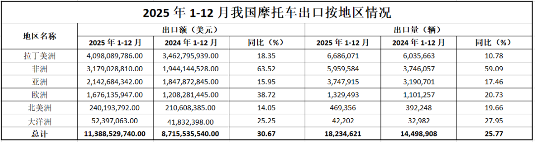 根据海关数据统计分析,2025年1-12月,我国摩托车整车出口量为1823.46万辆,较去年同期增长25.77%,出口额为113.89亿美元,较去年同期增长30.67%。其中: